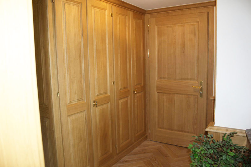 Armoire bois réalisée à Villars-sur-Ollon. L'exécution est en chêne massif avec verni effet naturel.