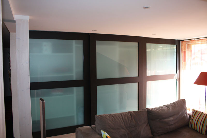 Armoire coulissante réalisée dans les environs de Monthey. L'exécution est en MDF teinté dans la masse avec verni mat et verres satinés.