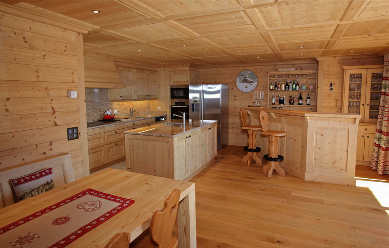 Cuisine en sapin étuvé brossé avec îlot central. Agencement avec un frigo américain, 2 points d'eau et hotte avec manteau en bois. Un bar convivial a été réalisé en sapin étuvé brossé ainsi que les différentes boiseries et le mobilier de la salle à manger tel que la table et le banc. On remarque surtout le magnifique plafond assemblé en bois.