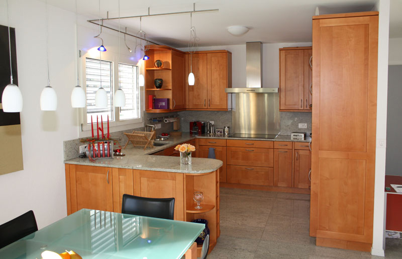 Agencement de cuisine en cerisier massif. Faces assemblées à plates-bandes et granit Kashmir White.