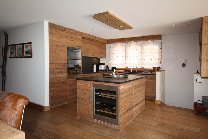 Cuisine avec une exécution en vieux bois, granit Noir Absolu et cave à vins intégrée dans l'îlot central. Réalisée pour un de nos client à Champéry en Valais.