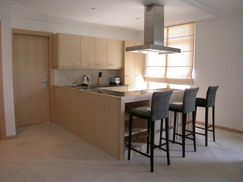 Cet agencement de cuisine a été posé à Château-d'Oex. L'exécution des faces est en placage lisse érable du Canada. Le plan de travail est en granit Impala.