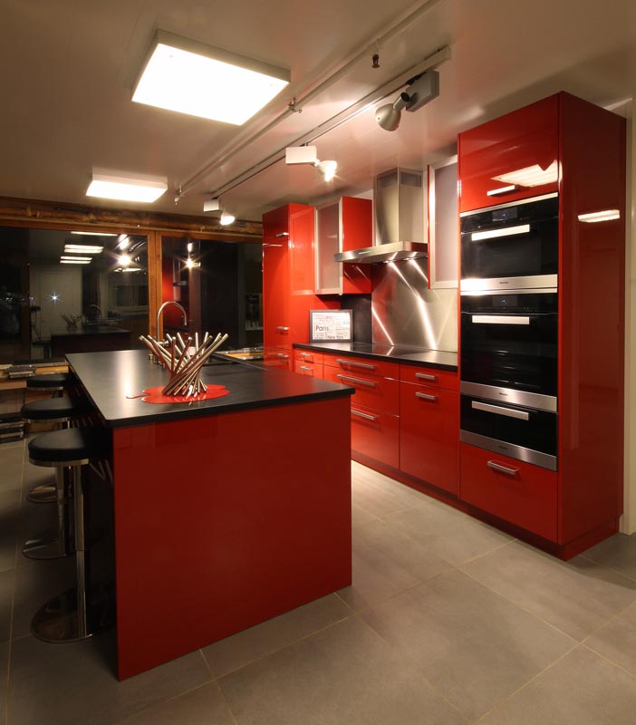 Cuisine en rouge brillant, plan de travail en granit noir absolu flammé brossé