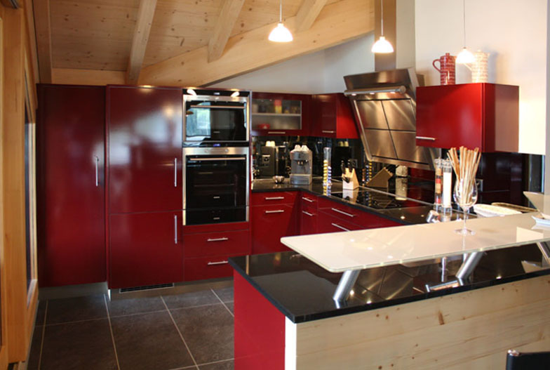 Cuisine réalisée à Champéry. C'est un agencement de cuisine en stratifié rouge brillant. Le plan de travail est en Noir Absolu et tablette du bar en verre sablé, La remontée entre-meubles est en miroir anthracite.