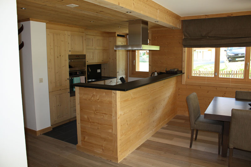 Cet agencement de cuisine a été réalisé à Champéry. L'exécution est en sapin étuvé brossé avec verni à effet naturel. Le plan de travail et la remontée entre-meubles sont en granit Noir Absolu flammé brossé.