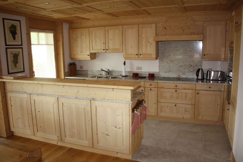 Cet agencement de cuisine se situe à Villars-sur-Ollon. L'exécution est en sapin étuvé brossé avec un verni à effet naturel.