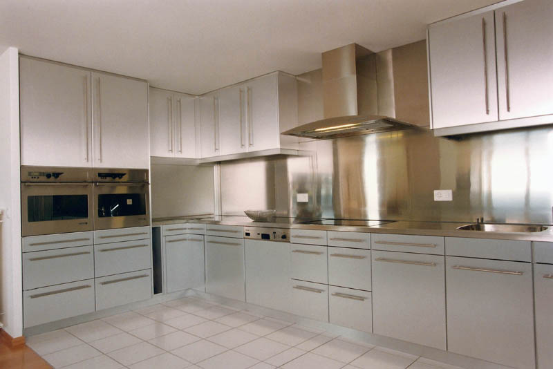 Cet agencement de cuisine, situé dans une villa près de Lausanne, présente des faces en panneau postformé stratifié alu. Le plan de travail ainsi que la remontée entre-meubles sont en inox brossé.
