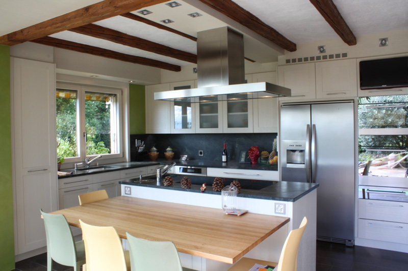 Rénovation d'un agencement de cuisine réalisé à Lausanne. Les faces à plates-bandes du mobilier sont en chêne brossé laqué blanc. L'îlot central avec plan de cuisson, hotte télescopique, poubelle pour composte et évier d'appoint. Frigo américain en inox avec distributeur de glaçons. Plans de travail et entre-meubles en granit Melo Grano satiné mat. Table bois en chêne clair massif. Les fenêtres en chêne sont exécutées avec la même finition que les portes de cuisine.