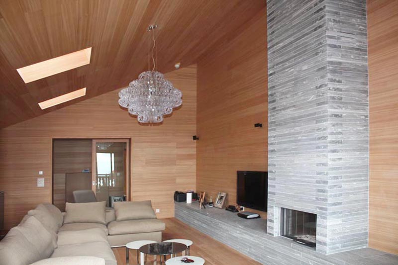 Boiseries réalisées à Montreux. L'exécution de ces parois et de ce plafond est en mélèze du pays veines horizontales avec verni effet naturel