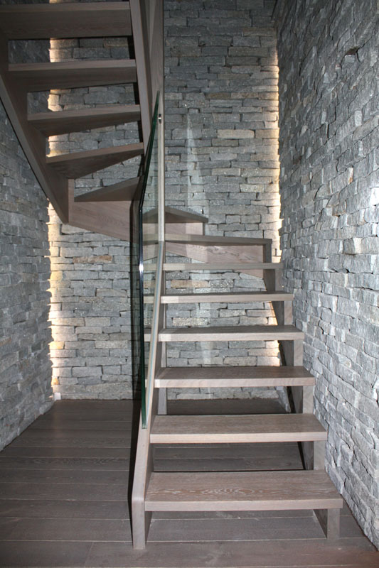 Escalier réalisé à Villars-sur-Ollon. L'exécution en chêne teinté brossé avec rampe en verre sécurisé