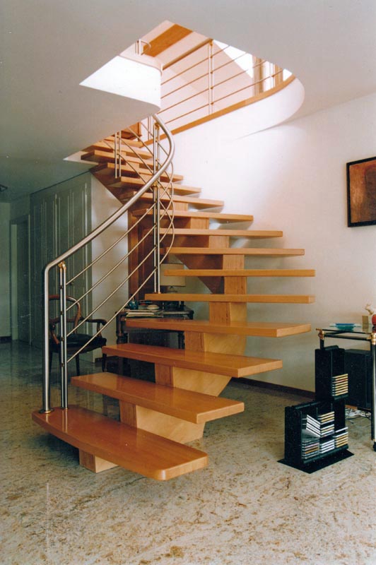 Escalier en hêtre avec limon central réalisé à Monthey. La main courante est en inox brossé.