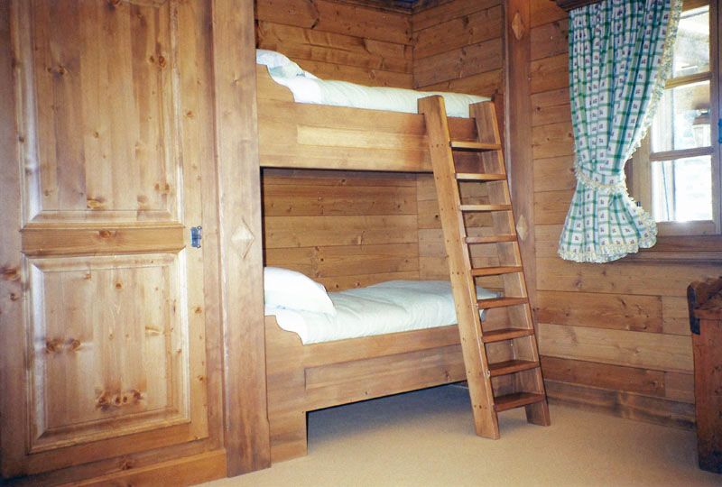 Lits à étage réalisé à Villars-sur-Ollon. L'exécution est en sapin teinté vieilli.