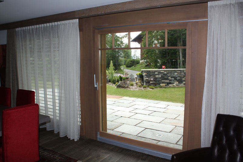 Fenetre coulissante à translation réalisée à Villars-sur-Ollon. L'exécution est en sapin brossé teinté verni imitation chêne cerusé, vitrage avec coefficient thermique U = 1.1