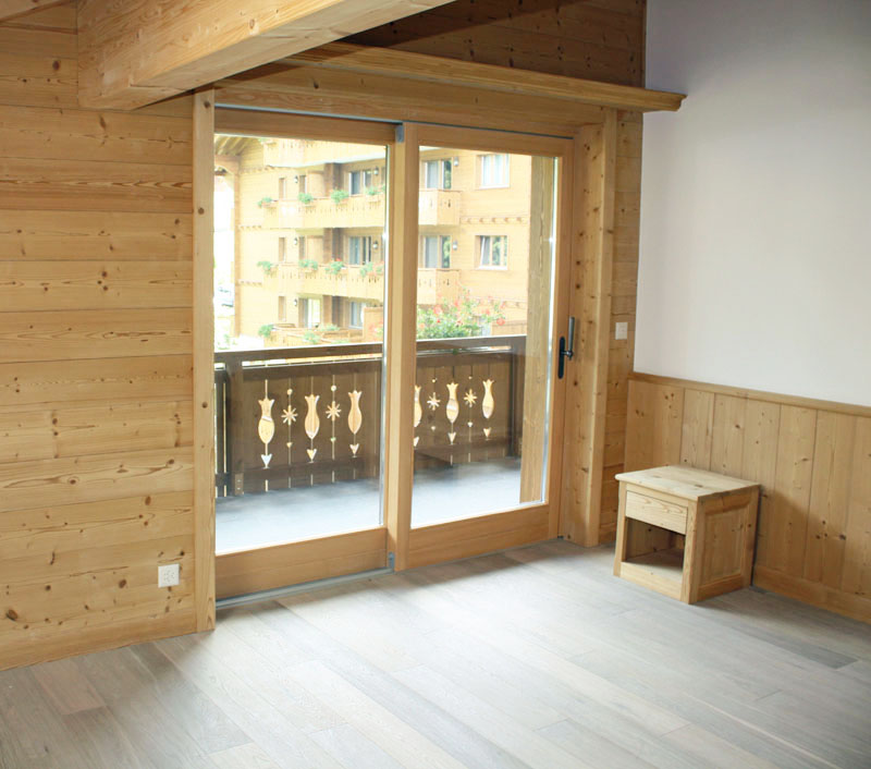 Fenêtre bois réalisée à Château-d'Oex. C'est une fenêtre coulissante à levage. L'exécution est en sapin étuvé brossé, triple-vitrage.