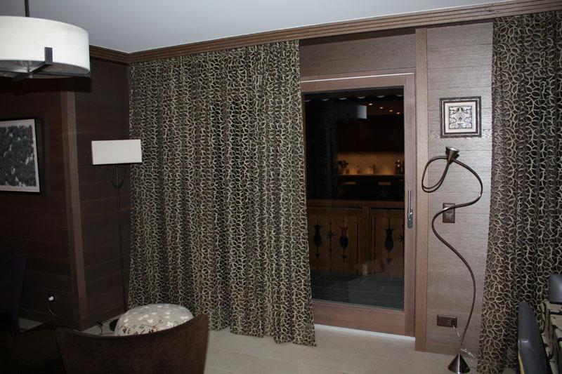 Fenêtre coulissante à levage en sapin et boiserie en chêne réalisée à Vevey. On peut remarquer le raccord de teinte entre la fenêtre en sapin et les boiseries en chêne