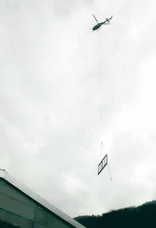 Transport par hélicoptère à Château-d'Oex d'une fenêtre coulissante de 8 mètres de long