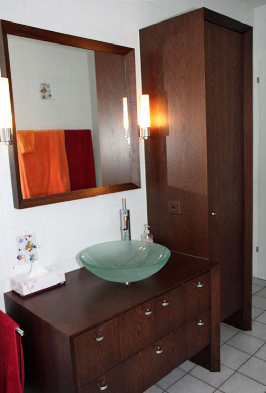 Meuble salle de bain réalisé à Monthey. L'exécution est en chêne brossé teinté avec un vernis à effet naturel.