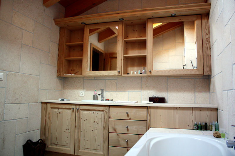 Meuble salle de bain réalisé à Leysin. L'exécution est en sapin étuvé verni effet naturel.