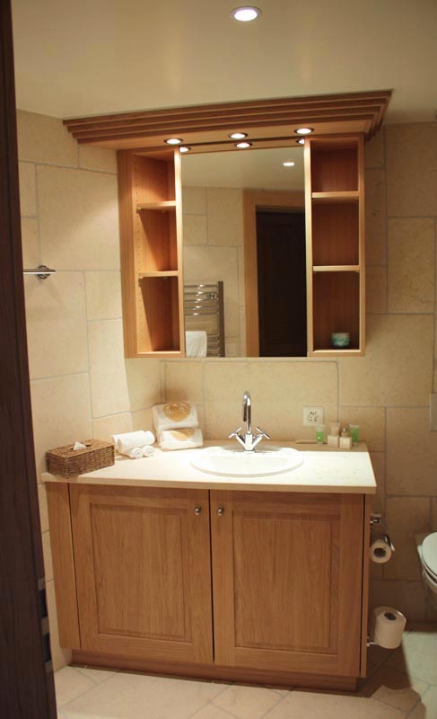Meuble salle de bain réalisé à Villars-sur-Ollon. L'exécution est en chêne avec un verni à effet naturel.
