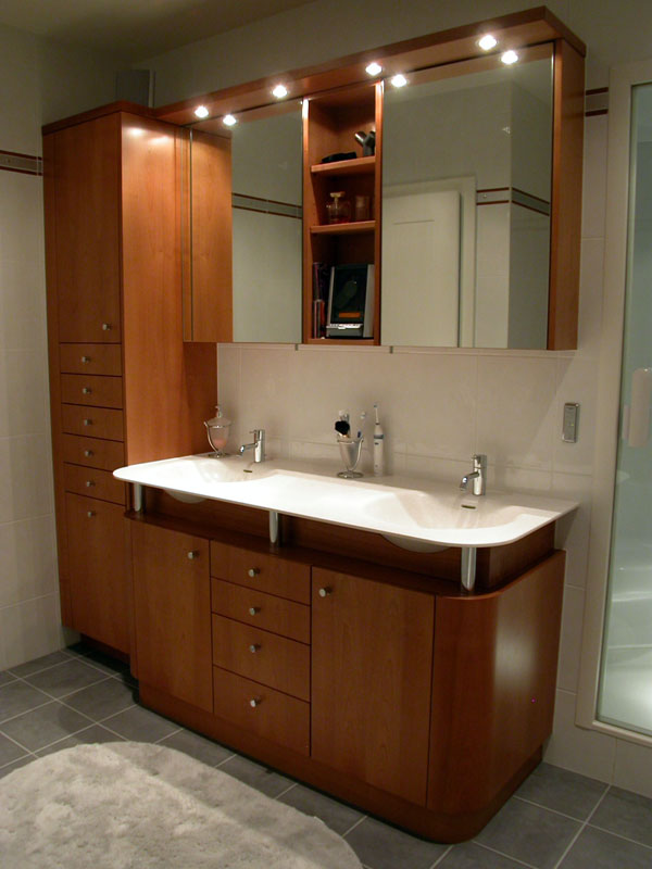 Meuble salle de bain réalisé à Monthey. L'exécution est en cerisier teinté verni avec tablette et double lavabo en Corian.