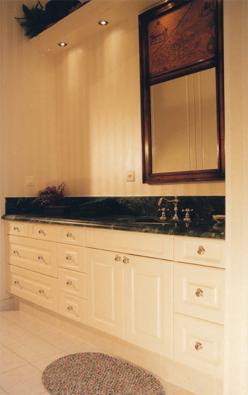 Meuble salle de bain réalisé à Montreux. Exécution du mobilier en MDF laqué mouluré. Le plateau est en granit avec une remontée contre le mur.
