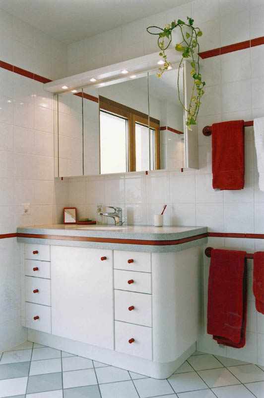 Meuble salle de bain en laque réalisé à Monthey, tablette et lavabo en Corian avec retombée peinte identique au carrelage.
