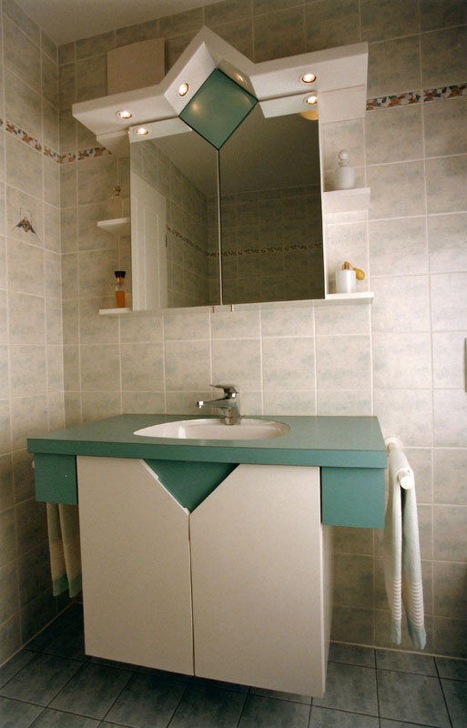 Meuble salle de bain réalisé à Monthey. L'exécution est en laque avec tablette et tiroirs en stratifié.