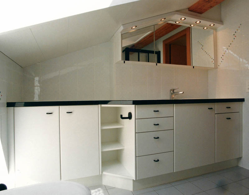 Meuble salle de bain réalisé à Monthey. L'exécution est en stratifié.