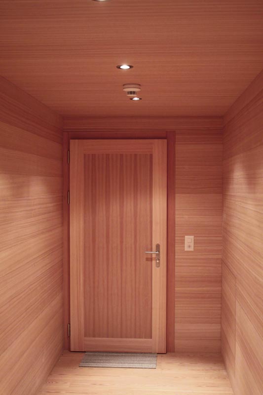 C'est une porte palière anti-feu selon norme AEAI posée à Château-d'Oex. L'exécution est en mélèze massif avec un verni à effet naturel.