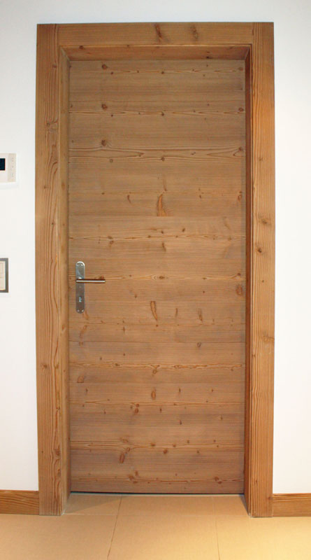 C'est une porte de communication en bois sapin étuvé brossé avec cire naturelle pour un appartement à Villars-sur-Ollon