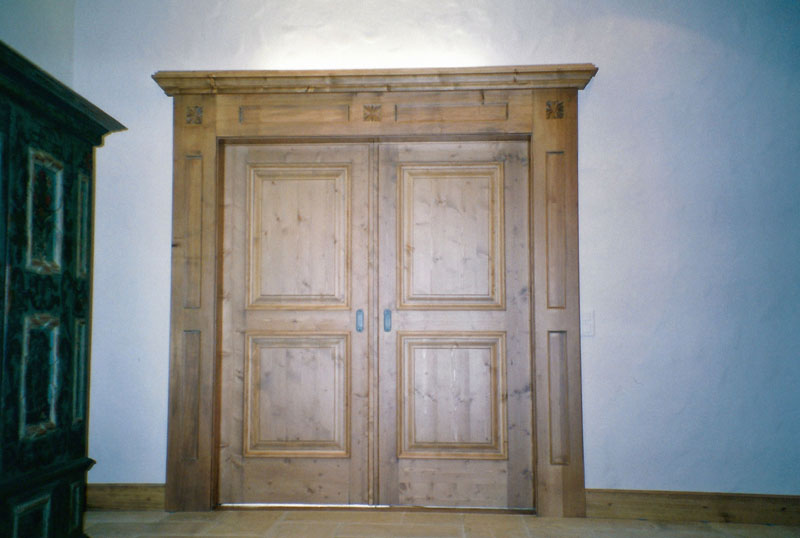 Porte intérieure coulissante à 2 vantaux réalisée à Gstaad. L'exécution est en sapin teinté vieilli avec panneaux assemblés à plates-bandes. Il y a une corniche supéreure sur le cadre avec un éclairage indirect intégré.