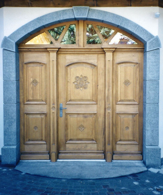 Porte d'entrée en bois posée à Villars-sur-Ollon. L'exécution est en sapin teinté avec une partie fixe vitrée cintrée sur le haut.