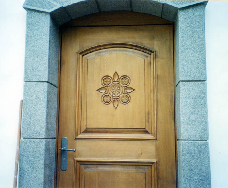 Porte d'entrée réalisée à Villars-sur-Ollon. L'exécution est en sapin teinté vieilli avec une rosace sculptée.