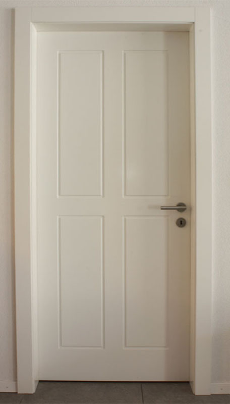 Porte intérieure moulurée réalisée à Monthey. Exécution en MDF défoncé laqué.